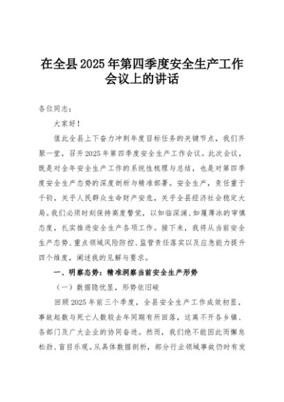 / 【七哥公文】2025年:在全县2025年第四季度安全生产工作会议上的讲话+更多免费公文+VX:QiGeGongWen2024