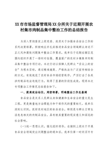 【七哥公文】2025年:XX市市场监督管理局XX分所关于近期开展农村集市肉制品集中整治工作的总结报告+更多免费公文+VX:QiGeGongWen2024