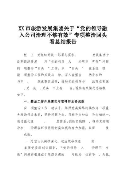 【七哥公文】2025年:XX市旅游发展集团关于“党的领导融入公司治理不够有效”专项整治回头看总结报告+更多免费公文+VX:QiGeGongWen2024