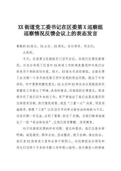 【七哥公文】2025年:XX街道党工委书记在区委第X巡察组巡察情况反馈会议上的表态发言+更多免费公文+VX:QiGeGongWen2024