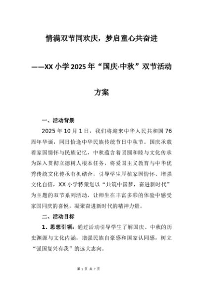 【七哥公文】2025年:XX小学2025年“国庆·中秋”双节活动方案:情满双节同欢庆,梦启童心共奋进+更多免费公文+VX:QiGeGongWen2024
