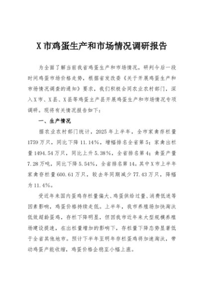 【七哥公文】2025年:X市鸡蛋生产和市场情况调研报告+更多免费公文+VX:QiGeGongWen2024