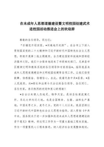 【七哥公文】2025年:在未成年人思想道德建设暨文明校园创建武术进校园活动推进会上的欢迎辞+更多免费公文+VX:QiGeGongWen2024