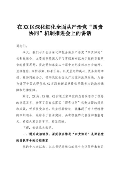 【七哥公文】2025年:在XX区深化细化全面从严治党“四责协同”机制推进会上的讲话+更多免费公文+VX:QiGeGongWen2024