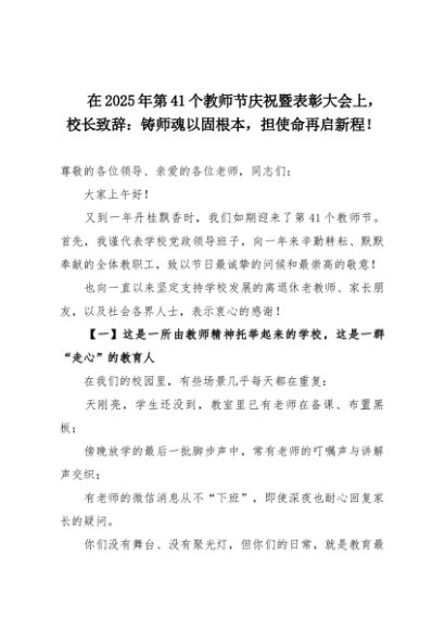 【七哥公文】2025年:在2025年第41个教师节庆祝暨表彰大会上,校长致辞:铸师魂以固根本,担使命再启新程!+更多免费公文+VX:QiGeGongWen2024