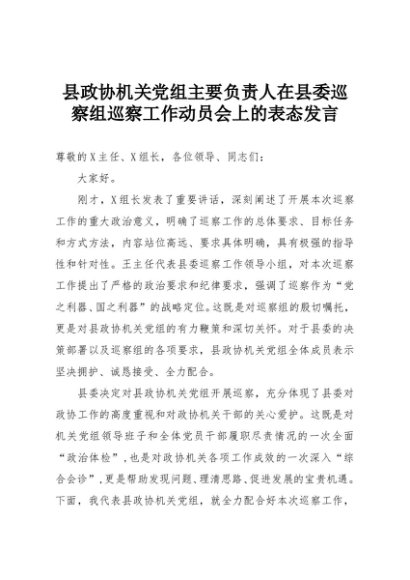 【七哥公文】2025年:县政协机关党组主要负责人在县委巡察组巡察工作动员会上的表态发言+更多免费公文+VX:QiGeGongWen2024