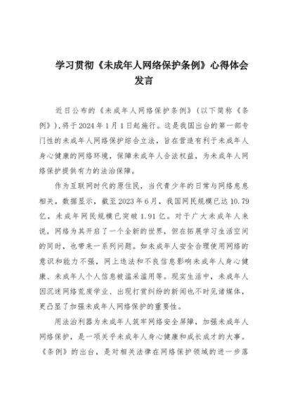 【七哥公文】2025年:学习贯彻《未成年人网络保护条例》心得体会发言+更多免费公文+VX:QiGeGongWen2024