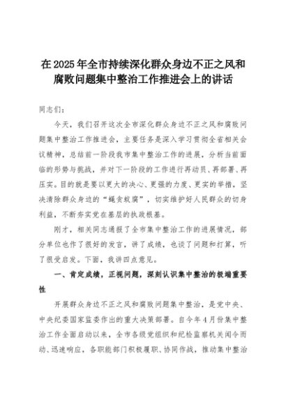 【七哥公文】2025年:在2025年全市持续深化群众身边不正之风和腐败问题集中整治工作推进会上的讲话+更多免费公文+VX:QiGeGongWen2024