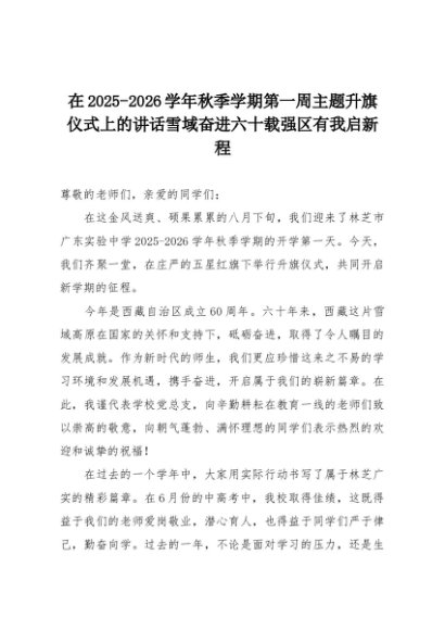 【七哥公文】2025年:在2025-2026学年秋季学期第一周主题升旗仪式上的讲话雪域奋进六十载强区有我启新程+更多免费公文+VX:QiGeGongWen2024