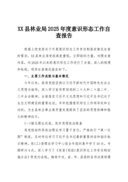 / 【七哥公文】2025年:XX县林业局2025年度意识形态工作自查报告+更多免费公文+VX:QiGeGongWen2024