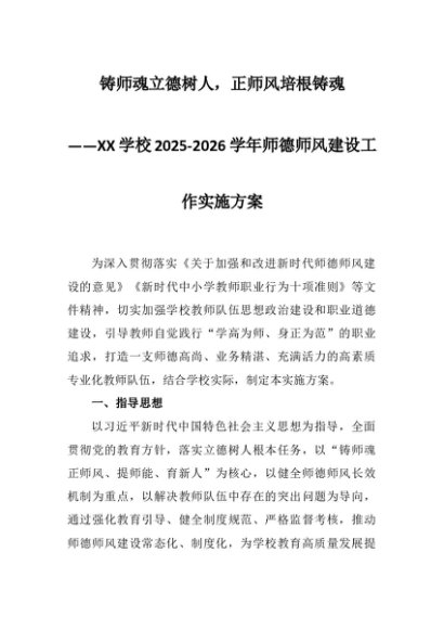 【七哥公文】2025年:XX学校2025-2026学年师德师风建设工作实施方案:铸师魂立德树人,正师风培根铸魂+更多免费公文+VX:QiGeGongWen2024