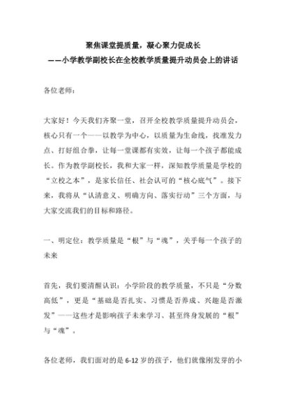 【七哥公文】2025年:聚焦课堂提质量,凝心聚力促成长——小学教学副校长在全校教学质量提升动员会上的讲话+更多免费公文+VX:QiGeGongWen2024