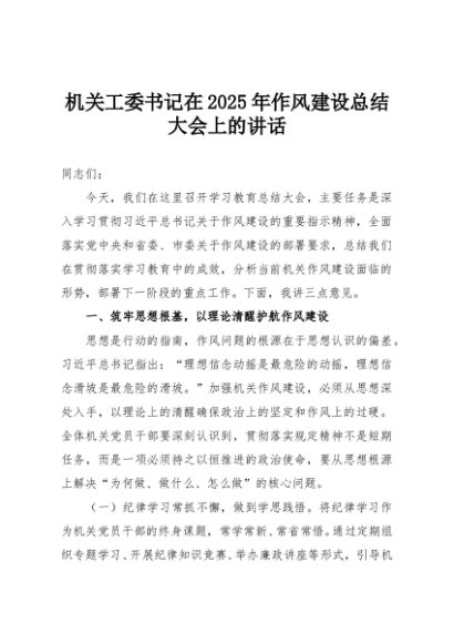 / 【七哥公文】2025年:机关工委书记在2025年作风建设总结大会上的讲话+更多免费公文+VX:QiGeGongWen2024