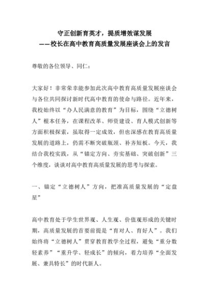 【七哥公文】2025年:守正创新育英才,提质增效谋发展——校长在高中教育高质量发展座谈会上的发言+更多免费公文+VX:QiGeGongWen2024