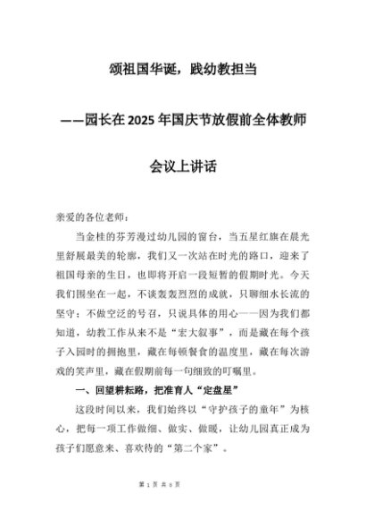【七哥公文】2025年:园长在2025年国庆节放假前全体教师会议上讲话:颂祖国华诞,践幼教担当+更多免费公文+VX:QiGeGongWen2024