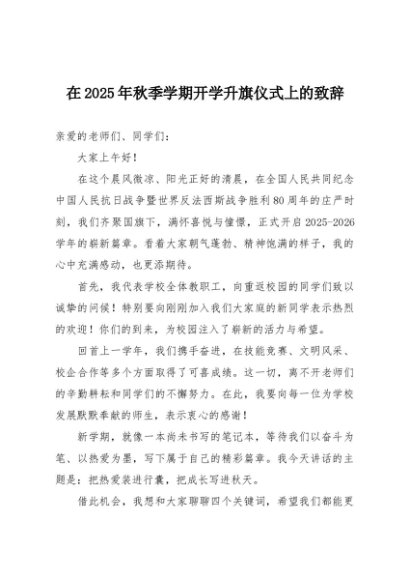 / 【七哥公文】2025年:在2025年秋季开学升旗仪式上的致辞+更多免费公文+VX:QiGeGongWen2024