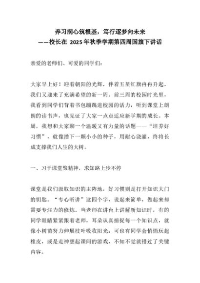 【七哥公文】2025年:养习润心筑根基,笃行逐梦向未来——校长在 2025年秋季学期第四周国旗下讲话+更多免费公文+VX:QiGeGongWen2024