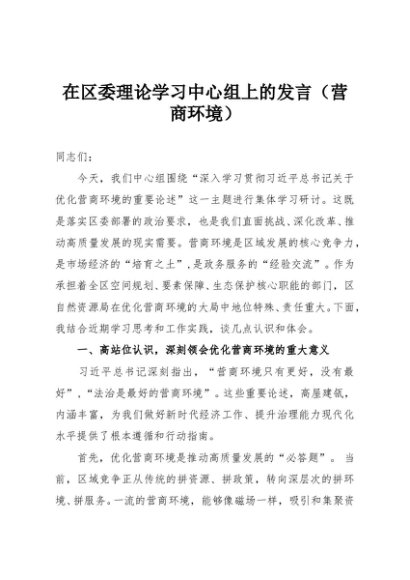 / 【七哥公文】2025年:在区委理论学习中心组上的发言(营商环境)+更多免费公文+VX:QiGeGongWen2024