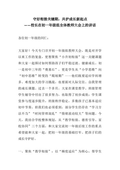 【七哥公文】2025年:守好衔接关键期,共护成长新起点——校长在初一年级组全体教师大会上的讲话+更多免费公文+VX:QiGeGongWen2024