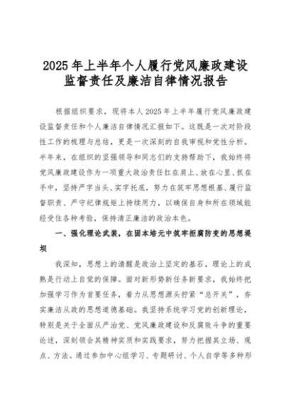 【七哥公文】2025年:2025年上半年个人履行党风廉政建设监督责任及廉洁自律情况报告+更多免费公文+VX:QiGeGongWen2024