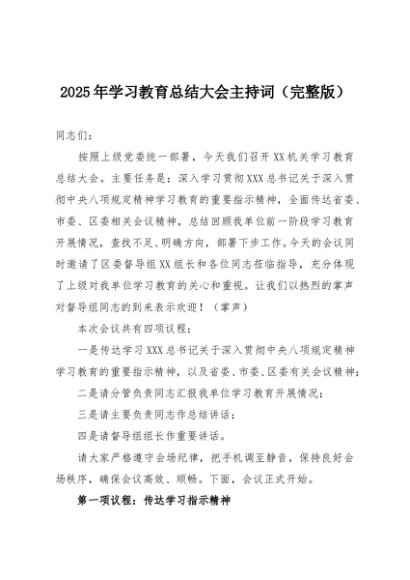 / 【七哥公文】2025年:2025年学习教育总结大会主持词(完整版)+更多免费公文+VX:QiGeGongWen2024