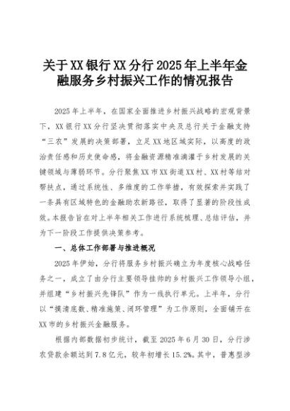 【七哥公文】2025年:关于XX银行XX分行2025年上半年金融服务乡村振兴工作的情况报告+更多免费公文+VX:QiGeGongWen2024