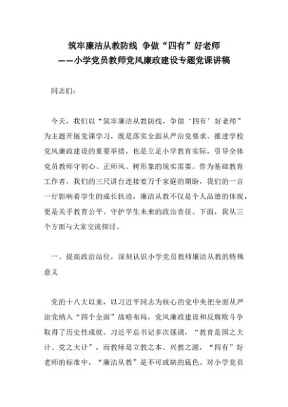 【七哥公文】2025年:筑牢廉洁从教防线 争做“四有”好老师 ——小学党员教师党风廉政建设专题党课讲稿+更多免费公文+VX:QiGeGongWen2024