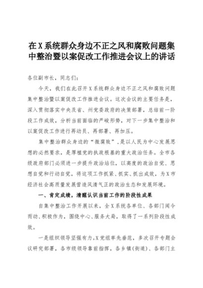 【七哥公文】2025年:在X系统群众身边不正之风和腐败问题集中整治暨以案促改工作推进会议上的讲话+更多免费公文+VX:QiGeGongWen2024