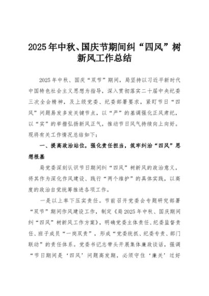 / 【七哥公文】2025年:2025年中秋、国庆节期间纠“四风”树新风工作总结+更多免费公文+VX:QiGeGongWen2024
