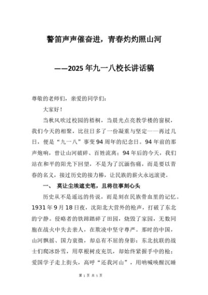 【七哥公文】2025年:2025年九一八校长讲话稿:警笛声声催奋进,青春灼灼照山河+更多免费公文+VX:QiGeGongWen2024