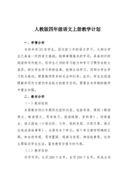 / 【七哥公文】2025年:人教版四年级语文上册教学计划+更多免费公文+VX:QiGeGongWen2024