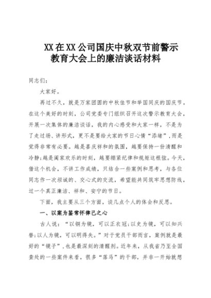 【七哥公文】2025年:XX在XX公司国庆中秋双节前警示教育大会上的廉洁谈话材料+更多免费公文+VX:QiGeGongWen2024