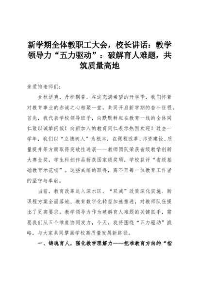 【七哥公文】2025年:新学期全体教职工大会,校长讲话:教学领导力“五力驱动”:破解育人难题,共筑质量高地+更多免费公文+VX:QiGeGongWen2024