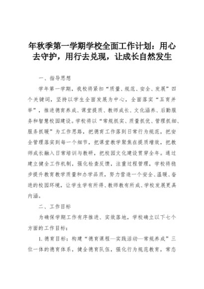 【七哥公文】2025年:年秋季第一学期学校全面工作计划:用心去守护,用行去兑现,让成长自然发生+更多免费公文+VX:QiGeGongWen2024