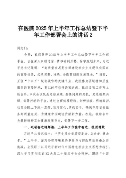 【七哥公文】2025年:在医院2025年上半年工作总结暨下半年工作部署会上的讲话2+更多免费公文+VX:QiGeGongWen2024