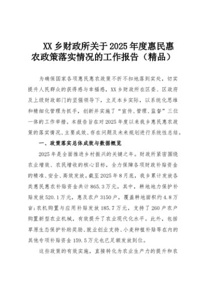 【七哥公文】2025年:XX乡财政所关于2025年度惠民惠农政策落实情况的工作报告(精品)+更多免费公文+VX:QiGeGongWen2024