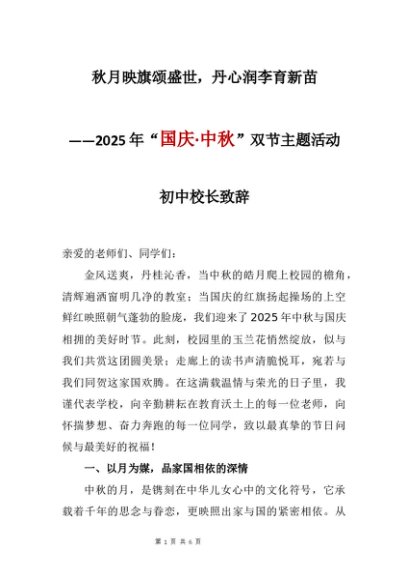 【七哥公文】2025年:2025年“国庆·中秋”双节主题活动初中校长致辞:秋月映旗颂盛世,丹心润李育新苗+更多免费公文+VX:QiGeGongWen2024