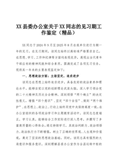/ 【七哥公文】2025年:XX县委办公室关于XX同志的见习期工作鉴定(精品)+更多免费公文+VX:QiGeGongWen2024