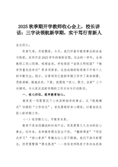 【七哥公文】2025年:2025秋季期开学教师收心会上,校长讲话:三字诀领航新学期,实干笃行育新人+更多免费公文+VX:QiGeGongWen2024