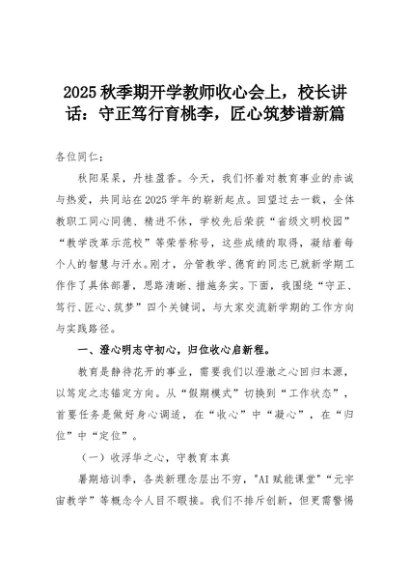【七哥公文】2025年:2025秋季期开学教师收心会上,校长讲话:守正笃行育桃李,匠心筑梦谱新篇+更多免费公文+VX:QiGeGongWen2024