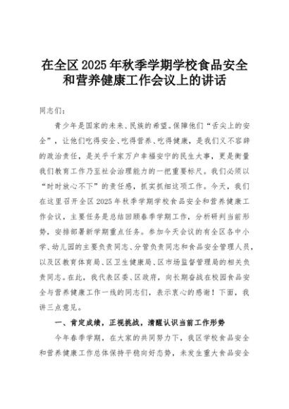 【七哥公文】2025年:在全区2025年秋季学期学校食品安全和营养健康工作会议上的讲话+更多免费公文+VX:QiGeGongWen2024