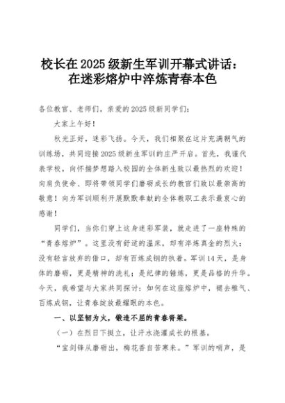 【七哥公文】2025年:校长在2025级新生军训开幕式讲话:在迷彩熔炉中淬炼青春本色+更多免费公文+VX:QiGeGongWen2024