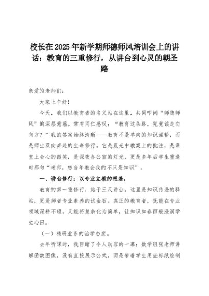 【七哥公文】2025年:校长在2025年新学期师德师风培训会上的讲话:教育的三重修行,从讲台到心灵的朝圣路+更多免费公文+VX:QiGeGongWen2024