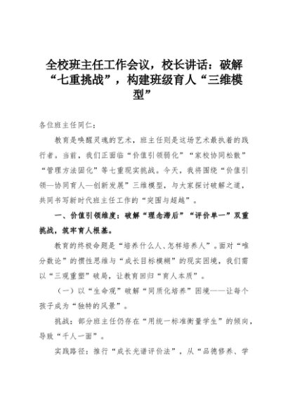 【七哥公文】2025年:全校班主任工作会议,校长讲话:破解“七重挑战”,构建班级育人“三维模型”+更多免费公文+VX:QiGeGongWen2024