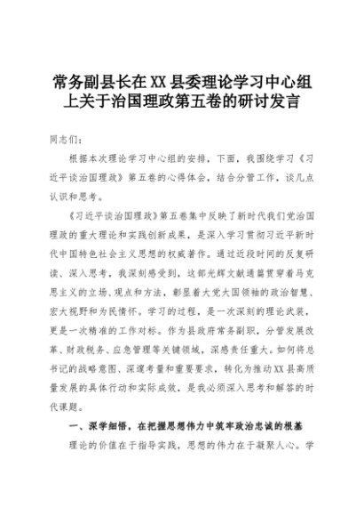 【七哥公文】2025年:常务副县长在XX县委理论学习中心组上关于治国理政第五卷的研讨发言+更多免费公文+VX:QiGeGongWen2024