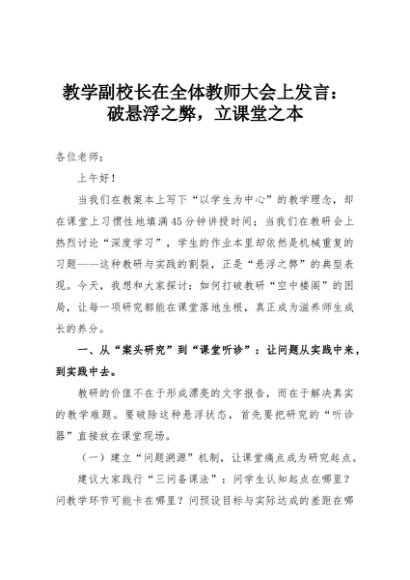 【七哥公文】2025年:教学副校长在全体教师大会上发言:破悬浮之弊,立课堂之本+更多免费公文+VX:QiGeGongWen2024