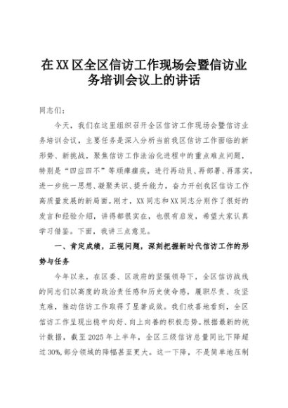 【七哥公文】2025年:在XX区全区信访工作现场会暨信访业务培训会议上的讲话+更多免费公文+VX:QiGeGongWen2024
