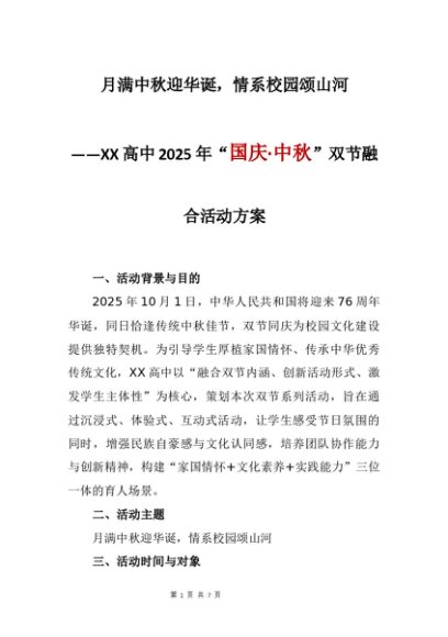 【七哥公文】2025年:XX高中2025年“国庆·中秋”双节融合活动方:月满中秋迎华诞,情系校园颂山河+更多免费公文+VX:QiGeGongWen2024