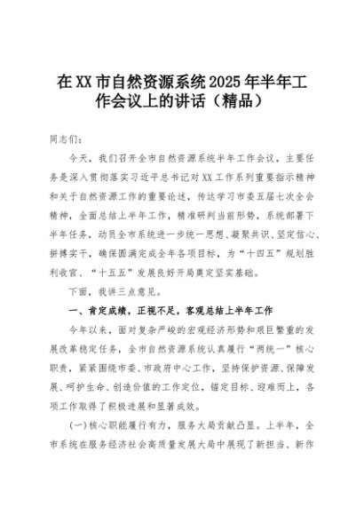 【七哥公文】2025年:在XX市自然资源系统2025年半年工作会议上的讲话(精品)+更多免费公文+VX:QiGeGongWen2024