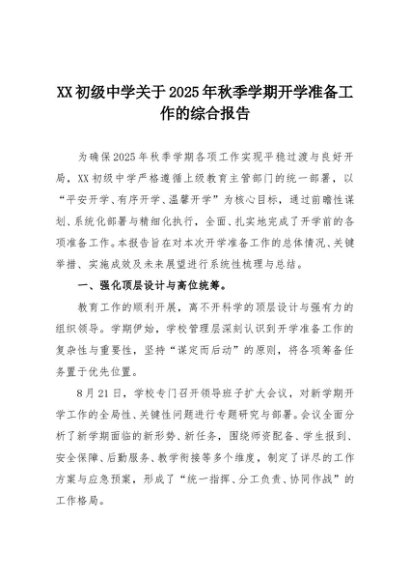 【七哥公文】2025年:XX初级中学关于2025年秋季学期开学准备工作的综合报告+更多免费公文+VX:QiGeGongWen2024